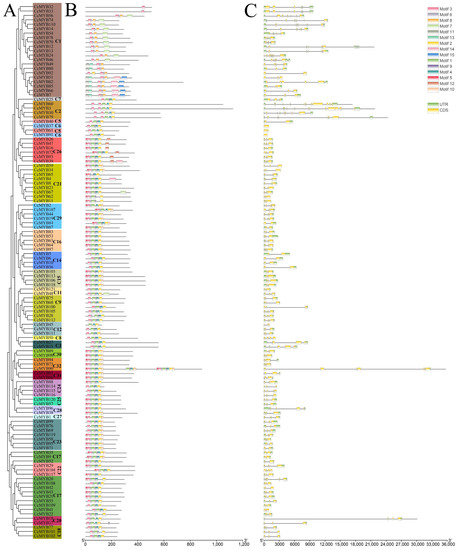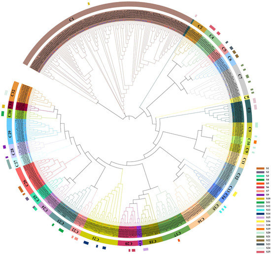 In this study, the phylogenetics of CcMYBs in camphor tree was analyzed with reference to 179 A. thaliana MYBs and 175 Populus trichocarpa MYBs (Table S2). The phylogenetic tree revealed that the CcMYBs could be divided into 28 subgroups (C4, C10, C13, and C19 subgroups did not contain CcMYBs), and each subgroup contained different proportions of members (Figure 1). The C1 subgroup had the most members, with 21 CcMYBs (17.36%), followed by the subgroup C17, which had 12 CcMYBs (9.92%), but C7, C8, and C27 each contained only 1 CcMYB (0.83%). The R2R3-MYB family in Arabidopsis is divided into 23 subgroups (S) based on conserved domains and accessory motifs [41]. Through the phylogenetic relationship analysis, we found that S7, S5, and S6 subgroups were clustered with the C22, C17, and C20 subgroups of camphor trees, respectively, as shown in Figure 1.