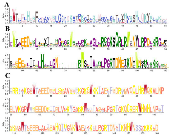 Multiple sequence alignments of 1R-MYB, R2R3-MYB, and 3R-MYB were performed separately to characterize the DNA-binding domain of CcMYBs in camphor. The DNA-binding domains in the three CcMYB subfamilies were visualized individually using WebLogo 3 (Figure 2). The results showed that Trp (W-2) was relatively conserved, despite the large variation in the 1R-MYB amino acid residues (Figure 2A), as in previous studies [1]. In the DNA-binding domain of R2R3-MYB, there were five highly conserved Trp (W) residues (W-2, W-22, and W-42 in R2 repeats; W-81 and W-100 in R3 repeats), and the first W in R3 was often replaced by Phe (F), Ile (I), Leu (L), or Tyr (Y). In addition, some other amino acids were also relatively conserved (Figure 2B). The 3R-MYBs displayed three highly conserved and complete DNA-binding domains: R1, R2, and R3. Each R repeat contained each of the 19–20 amino acid residues, and there were 100% conserved W residues (R1: W-9, W-29, W-48; R2: W-61, W-81, W -100; R3: W-113, W-132, W-151, Figure 2C). These conserved W residues play an important role in sequence-specific DNA binding [41,42].