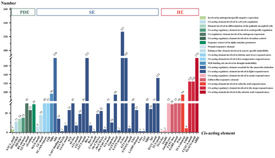 The number of various cis-acting elements. Different colors represent different functions. Each color group represents a different kind. The abbreviations in the above color group block, PDE: plant development-related elements; SE: stress-related elements; HE: hormone-related elements. The figure above each column represents the number of cis-acting elements.