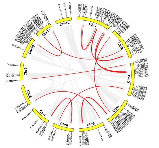 TBtools were used to construct a Circos map that displays the relationship between chromosomes and the position and relative distance of genes on chromosomes. Confirmation of CcMYB gene duplication was based on two criteria: (a) the length of the shorter sequence exceeding 70% of the longer sequence, and (b) the similarity between the two aligned sequences being greater than 70% [71,72]. All CcMYBs with duplicated segments were selected to generate a resonance map with putative duplicated gene pairs connected by connecting lines.