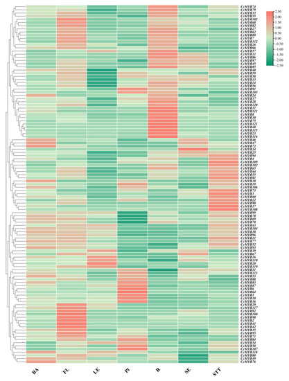 To investigate the spatial expression profiles of CcMYBs in C. camphora, we analyzed the expression of CcMYBs in the phloem (BA), flower (FL), leaf (LE), xylem (Pl), root (R), fruit (SE), and stem (STT) in ‘Gantong 1’. In the transcription data of seven tissues of C. camphora, four CcMYBs (CcMYB1, CcMYB9, CcMYB61, and CcMYB114) were not expressed in any tissue of C. camphora, which may be because they were pseudogenes or not expressed in our selected samples. The transcription levels of CcMYB37, CcMYB66, and CcMYB80 were higher in all tissues than most of the other genes (Table S3). Cluster analysis of the expressed data was performed and a heat map of CcMYB expression was generated, as shown in Figure 6. Thirty CcMYBs had higher FPKM values in the roots than in the other tested tissues, but only four CcMYBs had the highest expression levels in fruits. To explore whether CcMYBs in the C17, C20, and C22 subgroups were also tissue-specific, the expression of 16 CcMYBs were analyzed that did not count CcMYB9 because of the lack of expression in each tissue. Eight CcMYBs were found to have higher expression levels in the stem than in other tissues, and there were two CcMYBs with the highest expression in the phloem, suggesting that C. camphora flavonoids may mainly accumulate in the bark.