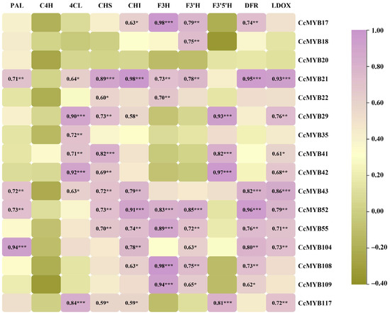 Correlation between CcMYB genes expression and the expression of structural genes in the flavonoid biosynthesis pathway. PAL, Phenylalanine ammonia lyase; C4H, Cinnamate 4-hydroxylase; 4CL, 4-coumarate:coenzyme A ligase; CHS, Chalcone synthase; CHI, Chalcone isomerase; F3H, Flavanone 3-hydroxylase; F3′H, Flavonoid 3′-hydroxylase; F3′5′H, Flavonoid 3′,5′-hydroxylase; DFR, Dihydroflavonol 4-reductase; LDOX, Leucoanthocyanidin dioxygenase. ***: p < 0.001, **: p < 0.01, *: p < 0.05.