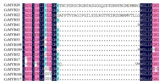 The conserved motifs of CcMYB were analyzed according to their amino acid sequences using the MEME program. The motif site distribution in the sequences was 0 or 1 per sequence. The number of motifs was set to 15, and the width ranged from six to 50 amino acids. Only the motif with an E < 0.05 was retained for further analysis. The results were visualized and enhanced using TBTools. The amino acid sequences of R1, R2, and R3 repeats in CcMYB were extracted, and ClustalW was used for multiple sequence alignment. Sequence logos were generated using WebLogo3 [71].