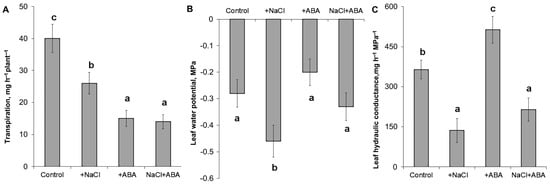 Effects of salinity and ABA treatment on transpiration (A), leaf water potential (B), and hydraulic conductance (C) of detached barley plant leaves. Statistically different values (n = 10) are labeled with different letters (Duncan test, p < 0.05).