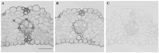 Immunohistochemical localization of HvPIP2;2 in mature leaf of 7-day-old barley of the control (A) and salt-treated plants (B) (1 h after addition of sodium chloride to the nutrient medium). Staining with nonimmune serum is also presented (C) (V—vasculature, m—mestome). Scale 100 µm.