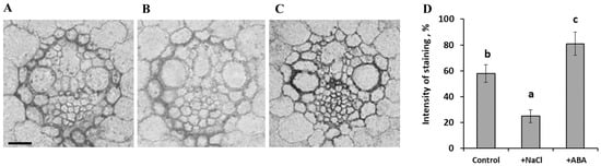 Immunohistochemical localization of HvPIP2;2 in the vasculature of leaves of the control (A), salt- (B), and ABA-treated (C) barley plants and semiquantitative estimation of the staining for HvPIP2;2 of vasculature cells (D). Statistically different values (n = 20) are labeled with different letters (Duncan test, p < 0.05). Scale 25 µm.