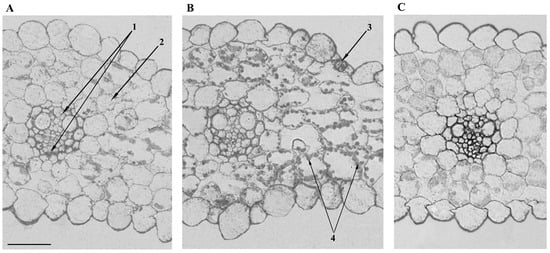 Immunohistochemical localization of ABA in the leaves of the control (A), salt- (B), and ABA-treated (C) barley plants. 1—vasculature, 2—mesophyll, 3—stomata, 4—chlorophyll. Scale 100 µm.
