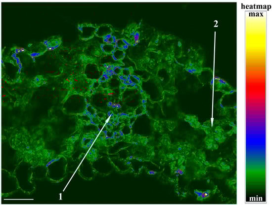 Localization of lignin in berberine-stained leaf cross sections of barley plants: 1—vasculature, 2—mesophyll. Heatmap represents intensity of fluorescence corresponding to lignin depicted by color. Scale 100 µm.