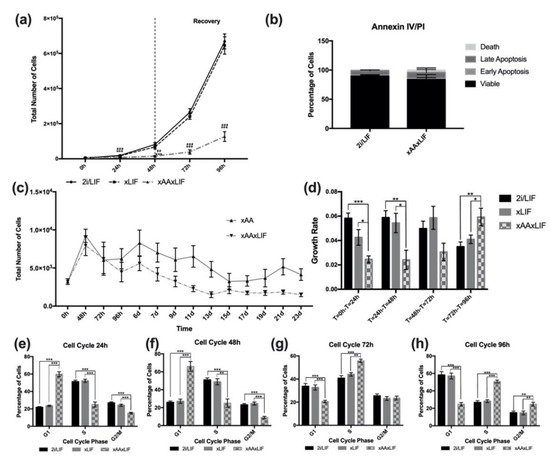LIF is a soluble cytokine, important in naïve embryonic stem-cell culture [18,19]. Additionally, LIF is synthesized by inner cell-mass cells (embryonic stem cells within the blastocyst) and uterine tissues, promoting uterine receptivity and embryo implantation [20,21]. Moreover, the absence of LIF affects embryo outgrowth and further development, despite not being required for embryo viability [20,21,22]. Taking into consideration these roles of LIF, we also aimed to evaluate whether the absence of LIF, in addition to Leu and Arg deprivation, would have the same impact on mESC proliferation as the absence of only Leu and Arg. In order to evaluate the impact of Leu and Arg and LIF deprivation on culture proliferation, we cultured cells in regular 2i medium without LIF supplementation (xLIF condition) and in xAA medium without LIF supplementation (xAAxLIF condition). Similar to the effects observed in the xAA growth curve, cells in xAAxLIF proliferated significantly less than cells in 2i/LIF or xLIF (Figure 2a), with irrelevant cell death (Figure 2b). Moreover, these cells can also be cultured for at least 23 days (Figure 2c), much like cells cultured in xAA medium. On the contrary, cells cultured without LIF presented an exponential growth similar to those cultured in 2i/LIF (Figure 2a). In addition, during recovery, the number of cells in the xAAxLIF condition increases (Figure 2a), which is more evident when looking at the growth rates. Indeed, the significant differences in the T = 72 h–T = 96 h interval, between the increased growth rate in the xAAxLIF condition compared to 2i/LIF and xLIF, show that cells recover exponential growth (Figure 2a,d). Furthermore, the decreased growth rate of xLIF cells showed the same trend as 2i/LIF (Figure 2d), and, after 96 h, the culture was also overpopulated. In agreement with the results for proliferation, after 24 h (Figure 2e) and 48 h (Figure 2f), the percentage of cells in the G1 phase was significantly higher in xAAxLIF cultured cells when compared to those in 2i/LIF and xLIF. Simultaneously, this alteration is accompanied by a significant decrease in the percentage of cells in the S and G2/M phases (Figure 2e,f). Additionally, xLIF cells, in accordance with the proliferation results, present an equivalent outcome at both time points as the control 2i/LIF condition (Figure 2e,f). Likewise, a lack of LIF, Leu, and Arg already affects progression from the G1 phase to the S and G2/mitotic phases after a 24 h culture period (Figure 2e), and the percentage of cells in the G1 phase is higher at 48 h (Figure 2f). However, analyzing the cell-cycle distribution of xLIF cells, the similarity to the 2i/LIF culture is noticeable (Figure 2e,f), even during recovery, when LIF is supplemented into the medium. Indeed, the percentage of cells in each phase of the cell cycle, at 72 h (Figure 2g) and also at 96 h (Figure 2g), remains identical to those of 2i/LIF. For this reason, we decided to end the experiments with the xLIF condition. When assessing the cell-cycle distribution of naïve mESCs of the xAAxLIF condition during the recovery period, we observed a decline in cells in G1, at the same time that the percentage of cells in the S and G2/M phases at both 72 h (Figure 1g) and 96 h (Figure 1h) increased, indicating progression through the cell cycle following LIF, Leu, and Arg reconstitution back into the culture medium. It is noteworthy that these results, in accordance with the growth curve and growth rate data, stress the notion that while Leu and Arg withdrawal (with LIF removal) induces proliferation arrest, caused by an impairment of progression from the G1 phase, LIF removal alone seemingly has no effect. This may occur because cells achieve a proliferative plateau, consistent with proliferation data, due to overpopulation.