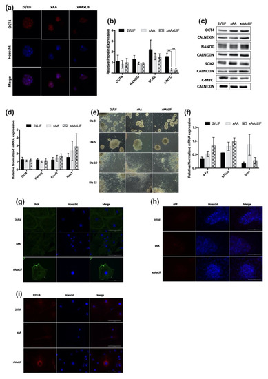 The effects of Leu and Arg withdrawal on mESC proliferation and the cell cycle are remarkable and in agreement with that which was observed for the trophectoderm cells and blastocysts when these amino acids are depleted from culture media [10,15,17]. Nevertheless, it is important to note that this does not negatively impact the cellular identity of naïve mESCs, nor their developmental potential. Regarding OCT4 (octamer-binding transcription factor 4 or POU domain, class 5, transcription factor 1) localization, this protein is detected at the nucleus (Figure 3a) in all conditions, as expected. Subsequently, we assessed the protein and mRNA levels of core pluripotency markers as well as markers of the pluripotency circuitry. Results demonstrate that protein expression of the core pluripotency genes OCT4, NANOG, and SOX2 (SRY-box transcription factor 2) is identical between conditions (Figure 3b). However, the levels of c-MYC (cellular myelocytomatosis oncogene) expression are lower when Leu, Arg, and LIF are absent in cell culture (Figure 3b). In terms of mRNA levels, for Oct4, Nanog, or the pluripotency circuitry genes Esrrb (estrogen related receptor beta) and Rexo1 (RNA exonuclease 1), no significant effects on the expression of these genes were observed in any of the conditions (Figure 3d). We also evaluated the differentiation potential of cells in each condition to confirm that these cells can contribute to all cell lineages, without any bias towards any specific embryonic leaflet. For this purpose, an embryoid body (EB) assay was carried out, and markers for each cell lineage were analyzed by RT-PCR and immunostaining. Despite the decrease in c-MYC protein levels for xAA and xAAxLIF cells, the potential of these cells to differentiate was not affected, since during the 15 days of the assay, cells were able to produce embryoid bodies that not only shared morphological similarities (Figure 3e) but also adhered, expanded, and differentiated similarly. This is shown by the uniformity of mRNA expression levels in each condition of aFp (alpha fetoprotein- endoderm layer marker) and b3Tub (beta-3-tubulin- ectoderm layer marker). Despite the trend to an increased Sma (smooth muscle actin- mesoderm layer marker) expression in xAA, there was no statistical significance between the expression levels of each condition (Figure 3f). Additionally, we were also able to detect positive staining in cells of each condition for the protein presence of SMA by immunocytochemistry (Figure 3g), b3TUB (Figure 3h), and AFP (Figure 3i). Overall, our results suggest that pluripotency is not affected by withdrawing Leu and Arg from the culture medium or by LIF withdrawal in addition to Leu and Arg removal.