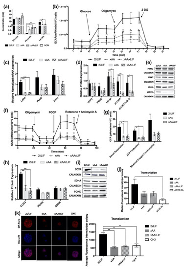 Leucine and Arginine absence prompts differential nutrient uptake and reduces overall glycolytic function. (a) Quantification of Glucose uptake from the extracellular medium after 48 h in experimental culture conditions (2i/LIF, xAA, and xAAxLIF) (NCM: n = 3); (2i/LIF, xAA, and xAAxLIF: n = 4). Pyruvate quantification after 48 h in all experimental culture conditions (2i/LIF, xAA, and xAAxLIF). (NCM: n = 3); (2i/LIF, xAA, and xAAxLIF: n = 4). Lactate quantification after 48 h in all experimental culture conditions (2i/LIF, xAA, and xAAxLIF), (NCM: n = 3) (2i/LIF, xAA, and xAAxLIF: n = 6). NCM-medium that was not in contact with cells. Results are presented as mean ± SEM. (b) Extracellular acidification rates (ECAR) measured using the Seahorse extracellular flux assay of cells maintained in 2i/LIF, xAA, and xAAxLIF conditions. Three measurements of ECAR were performed before and after the sequential injection of each of the three compounds: glucose (10 mM); oligomycin (1 μM), and 2-deoxyglucose (100 mM), respectively. The * symbol represents the statistical differences between 2i/LIF and xAAxLIF; the + symbol represents the statistical differences between 2i/LIF and xAA. Results are presented as mean ± SEM, (n = 4/group). (c) Evaluation of glycolytic-related gene expression by RT-PCR. mRNA levels of Ldha, Pkm2, and Hxk2 after 48 h in experimental culture conditions (2i/LIF, xAA, and xAAxLIF). Each gene expression was normalized to b-Actin levels. Results are presented as mean ± SEM, (n = 4/gene/group). (d) HXK2, PKM2, and LDHA and phosphorylated-LDHA (Tyr10) protein levels were determined by western blot after 48 h in the different experimental culture conditions (2i/LIF, xAA, and xAAxLIF) and were normalized to CALNEXIN levels, used as a loading control. The pLDHA/LDHA ratio was calculated after the normalization of both targets to CALNEXIN. Results are presented as mean ± SEM (HXK2: n = 6/group; PKM2: n = 7/group; LDHA: n = 7/group; pLDHA: n = 6/group; pLDHA/LDHA: n = 6/group). (e) Representative immunoblot membrane images for HXK2, PKM2, LDHA, and pLDHA and the relative CALNEXIN expression of each condition at 48 h. (f) Cell oxygen consumption rate (OCR) measured by Seahorse extracellular flux assay in 2i/LIF, xAA, and xAAxLIF conditions. Three measurements of OCR were performed before and after the sequential injection of each compound: oligomycin (5 μM), FCCP (2.5 mM), and rotenone plus antimycin (2.5 mM), respectively. The * symbol represents the statistical differences between 2i/LIF and xAA; the + symbol represents the statistical differences between 2i/LIF and xAAxLIF. Results are presented as mean ± SEM, (2i/LIF: n = 6; xAA and xAAxLIF: n = 5). (g) Basal respiration, respiration rate associated with ATP production, and estimated maximal oxygen consumption related to OCR data are represented as mean ± SEM, (2i/LIF: n = 6; xAA and xAAxLIF: n = 5). (h) COXIV, PDHK, and SDHA protein levels were determined by western blot after 48 h in each experimental culture condition (2i/LIF, xAA, and xAAxLIF) and were normalized to CALNEXIN levels. Results are presented as mean ± SEM (SDHA: n = 7/group; COX4, PDHK: n = 4/group). (i) Representative immunoblot membranes images for COX4, PDHK, and SDHA and the relative CALNEXIN expression of each condition at 48 h. See Appendix SB for the original membrane blot of COXIV and its respective CALNEXIN. (j) Panel of representative fluorescence microscopy images of OP-Puro incorporation for 1 h. Cells were previously cultured for 48 h in each of the 2i/LIF, xAA, and xAAxLIF conditions (magnification 630×)—(left). Average fluorescence intensity of OP-Puro incorporation for 1 h. Cells were previously cultured for 48 h in each of the 2i/LIF, xAA, and xAAxLIF conditions. Results are presented as mean ± SEM (n = 4/protein/group)—(right); (k) Median fluorescence intensity of cells positive for Alexa Fluor® 594 after EU incorporation during 1 h. Cells were previously cultured for 48 h in 2i/LIF, xAA, and xAAxLIF conditions. Results are presented as median ± SEM (n = 6/group). Statistical significance considered when * p < 0.05, ** p < 0.01, and *** p < 0.001. Specific tests: a one-way ANOVA followed by a Bonferroni or Dunnett T3 post-hoc test (when applicable) were performed for glucose media quantification; ECAR measurements after glucose, oligomycin, and 2-DG injections; ldha, pkm2, and hkk2 mRNA expression; HXK2 protein expression; for the basal OCR measurements 2 and 3, OCR measurements after FCCP injection and 3rd point OCR measure after rotenone and antimycin A injection; for basal respiration, ATP production and maximal oxygen consumption; COX4 and SDHA protein expression; and average fluorescence intensity/colony of transcription. The Kruskal–Wallis test followed by Mann–Whitney test (when applicable) were performed for pyruvate and lactate media quantification; basal ECAR measurements; PKM2, LDHA, pLDHA, and pLDHA/LDHA protein expression; 1st point of basal OCR measure, OCR measurements 1 and 2 after rotenone and antimycin A injection and OCR measurements after oligomycin injection; for PDHK protein expression; median fluorescence intensity. A t-test was performed to compare the 2i/LIF and NCM conditions of the pyruvate media quantification.