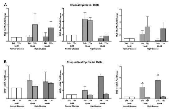 (A) Effect of a high glucose level (15 mM; 30 mM) on MUC 1, 4, and 16 gene expression in stratified human corneal epithelial cells. (B) Effect of a high glucose level (15 mM; 30 mM) on MUC 1, 4, and 16 gene expression in stratified human conjunctival epithelial cells. The data represent mean + S.E.M of cell culture experiments conducted in triplicate. * p < 0.05 compared to control cells exposed to normal (5 mM) glucose level.