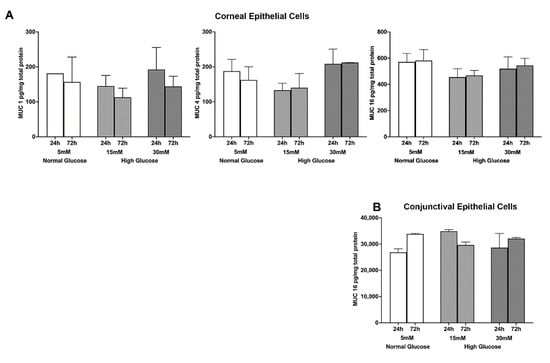Next, we tested the effect of a high glucose level on mucin protein expression. A high glucose exposure at a 15 mM concentration caused a notable decrease in MUC 1, MUC 4, and MUC 16 protein levels in the corneal epithelial cells, but the results were not statistically significant. It is worth noting that our ELISA method did not detect MUC 1 and MUC 4 protein levels in conjunctival epithelial cell lysates. It should also be noted that a 100-fold higher level of MUC 16 was detected in conjunctival epithelial cells compared to corneal epithelial cells. Furthermore, a high degree of glucose exposure did not cause any notable change in MUC 16 protein expression in conjunctival epithelial cells (Figure 2A,B).