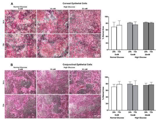 (A) Representative brightfield images showing effect of a high glucose level (15 mM; 30 mM) on MUC 16 barrier function as measured by rose bengal exclusion assay in stratified human corneal epithelial cells. (B) Representative brightfield images showing effect of a high glucose level (15 mM; 30 mM) on MUC 16 barrier function as measured by rose bengal exclusion assay in stratified human conjunctival epithelial cells. Epithelial cells with potential loss of MUC 16 are stained pink with rose bengal. Graphs show the percent-stained area as quantified using Image J software of n = 6 images/group. The images were obtained from cell culture experiments conducted in triplicate. Scale bar = 100 μM.