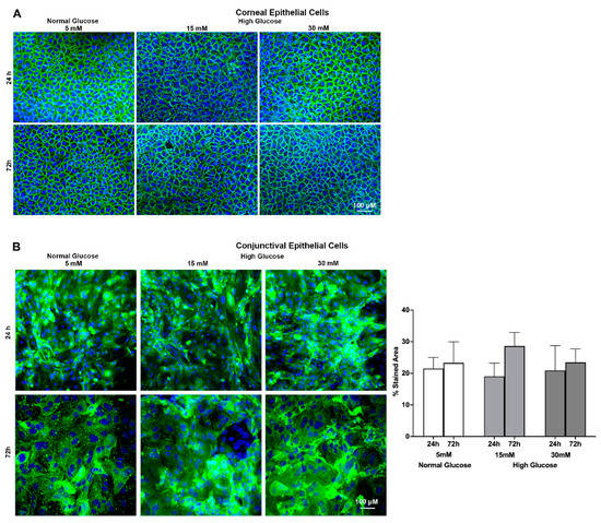 (A) Representative confocal microscopy images showing effect of a high glucose level (15 mM; 30 mM) on O-glycosylated Galβ1-3GalNAc oligosaccharide side chains of membrane-tethered mucins on stratified human corneal epithelial cells. (B) Representative confocal microscopy images showing effect of a high glucose level (15 mM; 30 mM) on O-glycosylated Galβ1-3GalNAc oligosaccharide side chains of membrane-tethered mucins on stratified human conjunctival epithelial cells. Nuclei are stained blue with DAPI, and O-glycosylated linked oligosaccharides are stained green with jacalin. Graphs show the percent-stained area as quantified using Image J software of n = 6 images/group. The images were obtained from cell culture experiments conducted in triplicate. Scale bar = 100 μM.