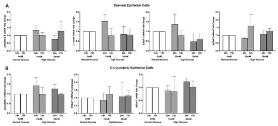Glycosyltransferases are a family of enzymes responsible for mediating the O-glycosylation of the side chains attached to membrane-tethered mucins [,]. There are four possible core O-glycosylation side chains (core 1–4) containing distinct combinations of oligosaccharides present on mucins. Only core 1 and core 2 O-glycosylation side chains are expressed on the membrane-tethered mucins of corneal and conjunctival epithelial cells [,]. The oligomerization of these core 1 and core 2 O-glycosylation side chains is mediated by glycosyltransferases’ core 1 synthase, glycoprotein-N-acetylgalactosamine 3-beta-galactosyltransferase 1 (C1GalT1), core 2 beta-1, 6-N-acetylglucosaminyltransferase (C2GnT), polypeptide N-acetylgalactosaminyltransferase (ppGalNAC-T), beta 1,3-galactosyltransferase (β3Gal-T), and beta 1,4 galactosyltransferase (β4Gal-T). Therefore, we tested the effect of a high glucose exposure on the gene expression of these five glycosyltransferases in stratified human corneal and conjunctival epithelial cells. Both stratified human corneal and conjunctival epithelial cells showed expression of ppGalNAC-T, C1GalT1, and β4Gal-T, with corneal epithelial cells also showing an expression of β3Gal-T (Figure 5A,B). High glucose exposure did not cause any notable change in the gene expressions of any of these glycosyltransferases for either the corneal or conjunctival epithelial cells.