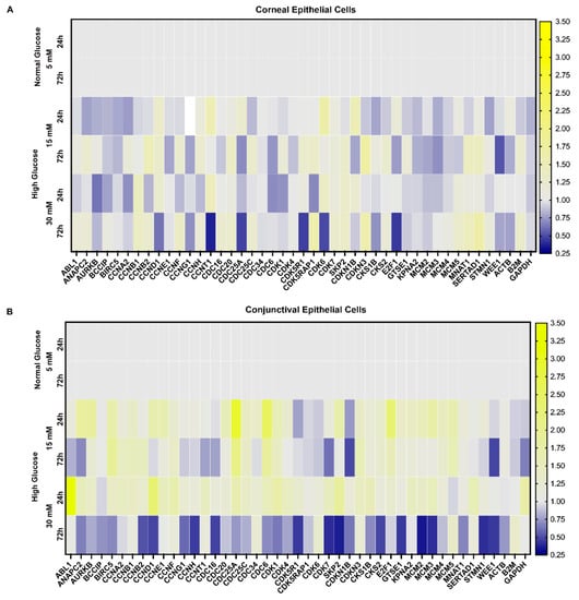 A commercially available gene array was used to quantify the expression of 42 genes involved in the cell cycle using cDNA obtained from corneal and conjunctival cells exposed to high glucose level. These genes are involved in regulation of G1 phase and G1/S transition (ANAPC2, CCND1, CCNE1, CDC34, CDK4, CDK6, SKP2, CDKN1B, CDKN3, and E2F1), S phase and DNA replication (ABL1, CDC6, MCM2, MCM3, MCM4, MCM5, and WEE1), G2 phase and G2/M transition (BCCIP, BIRC5, CCNA2, CCNB1, CCNG1, CCNH, CCNT1, CDC25A, CDK5R1, CDK5RAP1, CDK7, CDKN3, CKS1B, CKS2, GTSE1, KPNA2, MNAT1, and SERTAD1), M phase (AURKB, CCNB2, CCNF, CDC16, CDC20, CDC25C, CDC6, CDK1, and STMN1), cell cycle checkpoint and cell cycle arrest (CDC34, CDK1, CDKN1B, CDKN3, and WEE1), and regulation of the cell cycle (ABL1, ANAPC2, BCCIP, CCNB1, CCNB2, CCND1, CCNE1, CCNF, CCNH, CCNT1, CDC16, CDC20, CDC25C, CDC6, CDK1, CDK4, CDK5R1, CDK6, CDK7, SKP2, CDKN1B, CKS1B, E2F1, and WEE1).