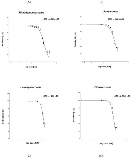 We found that the IC50 of trabectedin was 1.296 nM for LMS, 0.6836 nM for LPS, 0.9654 nM for RMS, and 0.8549 nM for FS. Then, cell viability is reported as a percentage versus the control (Figure 1).