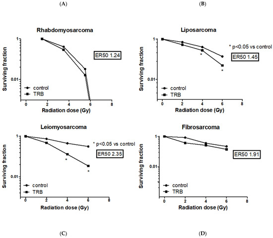Evaluation of surviving fraction after irradiation with increasing doses in rhabdomyosarcoma RD (A), liposarcoma SW872 (B), leiomyosarcoma HS5.T (C), and fibrosarcoma HS 93.T (D) cell lines, respectively, the control, pretreated with trabectedin, were irradiated with 0–6 Gy. Surviving fraction is shown as the mean ± SEM. * p ≤ 0.05 vs. the control.