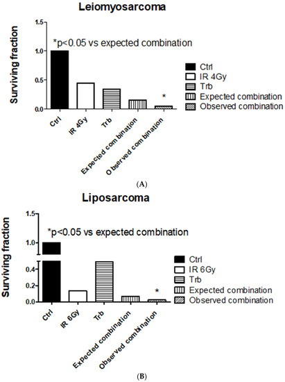 Trabectedin (trb) combined with radiation-induced synergistic effect in leiomyosarcoma (HS5.T) and liposarcoma (SW872) cells. (A) Leiomyosarcoma HS5.T. (B) Liposarcoma SW872. Observed combination: surviving fraction observed after irradiation (IR) with trabectedin (trb) treatment. Expected combination: surviving fraction calculated as the product of the surviving fractions observed after treatment with trabectedin or radiation alone. Data are shown as the means ± SEM. * p ≤ 0.05 vs. the expected surviving fraction. Ctrl: control.