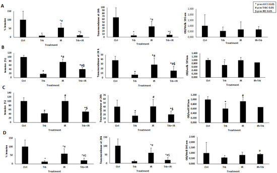 Invasion assay in STS cell lines. The matrigel cell invasion assay was performed in each STS cell line after irradiation (IR) and/or in the presence of trabectedin (trb). Columns: capability of invasion reported in % (left) and at 24 h (middle), quantification of 595 nm with a plate reader (right) for rhabdomyosarcoma RD (A), liposarcoma SW872 (B), leiomyosarcoma HS5.T (C), and fibrosarcoma HS 93.T (D) * p ≤ 0.05 vs. control, # p ≤ 0.05 vs. trb, $ p ≤ 0.05 vs. IR.