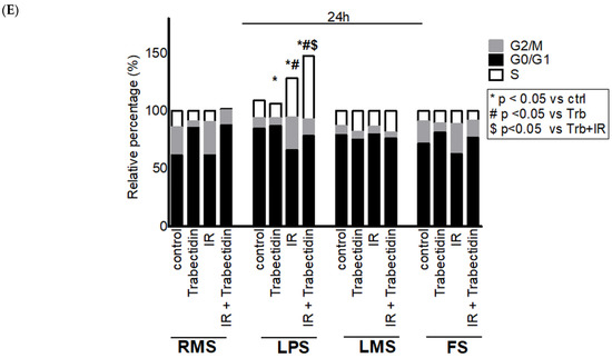 Trabectedin alone showed a non-specific perturbation in the cell cycle progression profile in FS and RMS, whereas it seemed to have no effect in LPS and LMS compared to the control. In IR alone, we observed a slight increase (5%) of the cells in the G2/M phase in RMS and FS. Interestingly, we found a strong increase (+20%) of G2/M-phase cells in IR alone in LPS compared to the control, suggesting an enhanced cell cycle arrest in the G2/M phase. Instead, LMS treated with IR alone did not change the cell cycle profile compared to the control. Trabectedin + IR treatment showed a significant reduction in G2/M-phase cells in both LMS and RMS, whereas in LPS, it was associated with a modest increase, although inferior to IR alone. In FS, the combined treatment seemed not to modify cell cycle redistribution (Figure 5).