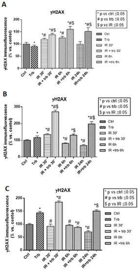 Trabectedin significantly increased the mean immunofluorescence emitted by γ-H2AX foci in irradiated rhabdomyosarcoma RD (A), liposarcoma SW872 (B), and leiomyosarcoma HS5.T (C) cell lines. The mean γ-H2AX immunofluorescence is reported as a percentage of the control and shown as the mean ± SEM. * p ≤ 0.05 vs. control (ctrl); # p ≤ 0.05 vs. trabectedin (trb); $ p ≤ 0.05 vs. irradiation (IR).