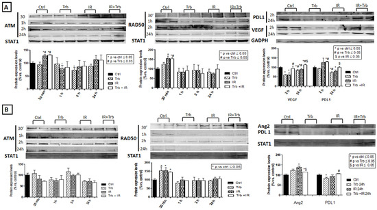Trabectedin affects protein expression in leiomyosarcoma HS5.T (A) and liposarcoma SW872 (B). Western blot analysis of the expression of ATM, RAD50, VEGF, Ang-2, and PDL-1 in leiomyosarcoma (HS5.T) and liposarcoma SW872 cells treated with the vehicle (control, ctrl), 4 Gy irradiation (IR) alone, or with trabectedin (Trb), respectively. GAPDH and STAT1 were used as loading controls. Data reported as the percentage versus the respective control (set at 100) are shown as the mean ± SEM. * p ≤ 0.05 vs. control, # p ≤ 0.05 vs. trabectedin, $ p ≤ 0.05 vs.IR.
