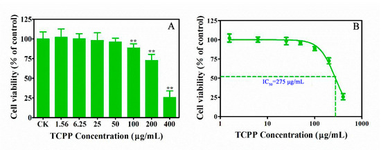Cytotoxicity of TCPP on HaCaT cells after exposure to 1.56–400 µg/mL TCPP for 24 h (A) and logarithmic transformation of TCPP concentrations and cell viability data to determine IC50 (B). ** p < 0.01.