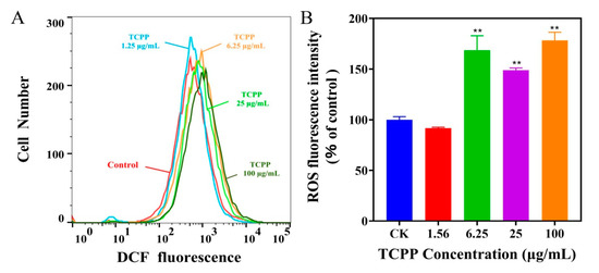 The level of intracellular ROS was examined using a ROS assay kit (Yi Fei Xue Biotech Co., Ltd., Nanjing, China) according to the manufacturer’s instructions. Briefly, the HaCaT cells were seeded to 6-well plates and incubated overnight at 37 °C in a 5% CO2 incubator at the density of 1 × 106 cells/mL. Based on the median inhibitory concentration (IC50) at 275 μg/mL, the cells were treated with TCPP at 1.56–100 μg/for 24 h. Then, the cells were incubated with 10 μM DCFH-DA-containing serum-free medium for 20 min at 37 °C. Cells were washed three times with PBS. Subsequently, the level of intracellular ROS was detected using a flow cytometer (CyFlow®Cube 6, Patec, Nuremberg, Germany). Data were collected from 10,000 cells and analyzed by the FlowJo v10.6.2 software (FlowJo LLC, Ashland, OR, USA).