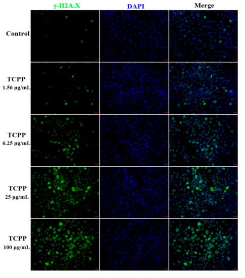 TCPP induced DNA damage in HaCaT cells after exposure to 1.56–100 μg/mL TCPP for 24 h. The green fluorescence intensity of γ-H2AX (green) was elevated by increasing TCPP concentration in HaCaT cells, suggesting aggravation of DNA damage. DAPI counterstains the nuclei (blue), 200× magnification. Scale bar 20 μm.