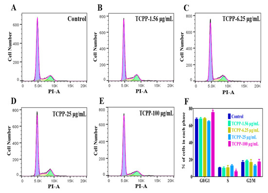 Cell cycle arrest was measured by flow cytometry after exposure to 1.56–100 μg/mL TCPP for 24 h (A–E) and the change of cell population induced by TCPP (F). TCPP caused a marked G0/G1 cell cycle arrest, evidenced by a higher number of cells residing in the G0/G1 phase and reducing S phase entry, especially at 100 μg/mL (* p < 0.05).