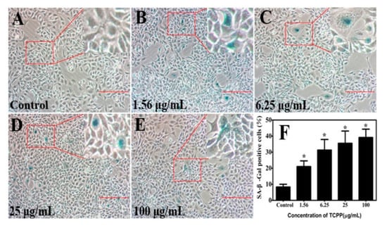 TCPP increased senescence markers (senescence-associated-β -galactosidase (SA-β-Gal) activity) in cultured HaCaT cells (A–E) after exposure to 1.56–100 µg/mL TCPP for 24 h (A–E), and the percentage of SA-β-Gal positive cells (blue color) was shown in (F). The senescence phenotype was seen as blue staining cells. 200× magnification. Scale bar 100 μm. * p < 0.05.