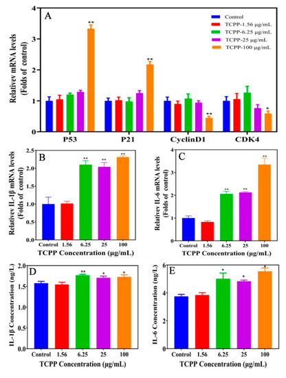 TCPP changed cell senescence and cycle (A) and SASP (B–E) regulatory gene expression of HaCaT cells after exposing them to 1.56–100 µg/mL TCPP for 24 h. * p < 0.05, ** p < 0.01.