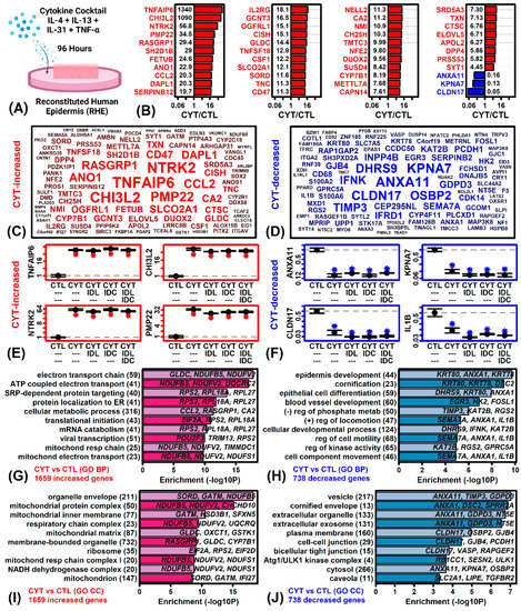 2.2. Cytokines Induce Inflammatory and Mitochondrial Gene Expression but Repress Epidermal Development and KC Differentiation Pathways