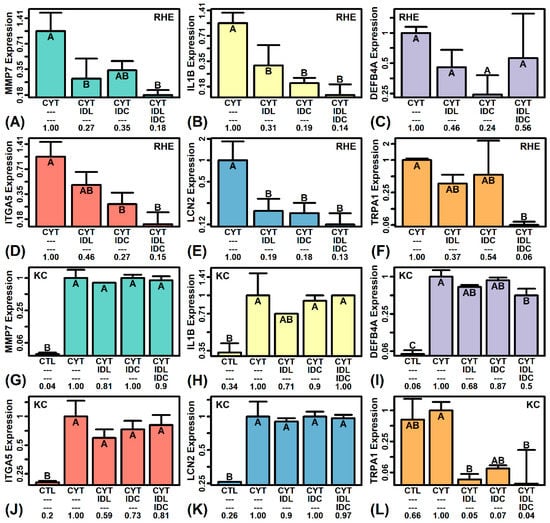 2.5. IDL, IDC and IDL + IDC Increase Expression of Basal Layer and Early KC Differentiation Genes but Repress Expression of Genes Associated with Late KC Differentiation