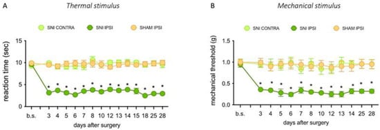 Hypernociceptive behavior of SNI mice. SNI produced a long-lasting thermal (A) and mechanical (B) allodynia from day 3 up to day 28 after surgery. Data are means ± SEM. * p < 0.001 versus contra (two-way ANOVA followed by Bonferroni test).