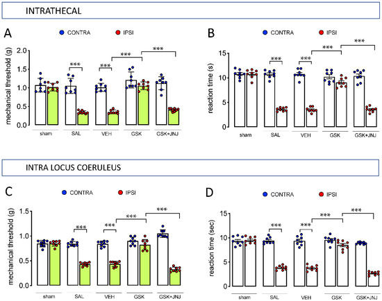To evaluate whether this activity was related to the modulation of the histaminergic system within the central nervous system and to exclude the involvement of peripheral mechanisms, GSK189254 was administered directly to the central nervous system (CNS). Intrathecal (i.t) administration of GSK189254 (6 µg/mouse) ameliorated mechanical (Figure 3A) and thermal (Figure 3B) allodynia, and these effects were prevented by treatment with the H4R antagonist JNJ 10191584 (6 µg/mouse). Intra locus coeruleus (LC) administration of GSK189254 (10 µg/µL) produced a similar efficacy in attenuating mechanical (Figure 3C) and thermal (Figure 3D) allodynia. Consistently, intra-LC administration of JNJ 10191584 (10 µg/µL) abolished the anti-hyperalgesic activity of the H3R antagonist.