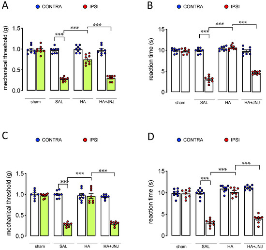 H4R-mediated anti-neuropathic effect of histamine (HA) and VUF8430 (VUF) on neuropathic pain symptoms in SNI mice. Intrathecal (i.t.) administration of HA (40 µg/mouse) reversed mechanical (A) and thermal (B) allodynia in SNI mice. This effect was antagonized by JNJ 10191584 (JNJ) (6 µg/mouse i.t.). I.t. injection of VUF8430 (20 µg/mouse) attenuated mechanical (C) and thermal (D) allodynia. JNJ 10191584 (6 µg/mouse i.t.) reversed this effect. SAL: saline. *** p < 0.001 (one-way ANOVA followed by Tukey test).