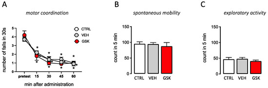 Lack of locomotor impairments by GSK189254. Oral administration of GSK189254 (GSK) (6 mg/kg p.o.) did not alter motor coordination (A), spontaneous mobility (B), or exploratory activity (C). CTRL: untreated mice; VEH: 5% DMSO. * p < 0.05 vs. pretest (two-way ANOVA followed by Bonferroni test).