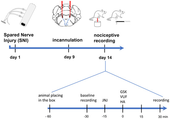 Animals were habituated to the testing environment daily for at least 2 days before baseline testing. Behavioral testing was performed before surgery to establish a baseline for comparison with postsurgical values. For time-course studies, nociceptive responses to mechanical and thermal stimuli were measured daily from day 3 to day 28 after nerve surgery. Nociceptive recordings to evaluate the effects of drug treatments were conducted on day 14 post-surgery (Figure 7). Each mouse served as its own control, the responses being measured both before and after surgery. All testing was performed with a blind procedure.