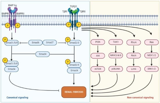 Representation of the TGF-β/Smad signaling. TGF-β1 binds to its receptors and induces a cascade of signal transductions via both canonical (blue) and noncanonical (red) signaling. When TGF-β1 binds to its receptors, it triggers the phosphorylation and activation of Smad2/3, which translocate to the nucleus, inducing the transcription of TGF-β1-responsive genes and a pro-fibrotic response. This process can be blocked by Smad7, who inhibits Smad2/3. On the other hand, when BMP7 binds to its receptors triggers the phosphorylation on Smad1/5/8, which induce an anti-fibrotic response. In addition, TGF-β also activates the noncanonical signaling pathways able to influence renal inflammation and fibrosis. In this case, renal fibrosis is caused by the activation of pathways such as MAP kinase, PI3K/Akt, and Rho kinase, and is triggered by mediators such as angiotensin II and advanced glycation end products (AGEs) [Created with Biorender (https://biorender.com), accessed on 7 November 2022].
