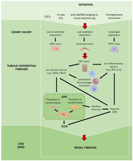 Main mechanisms involved in the pathogenesis of renal fibrosis in LN. Abbreviations: CIC—circulating immune complex; CKD—chronic kidney disease; ECM—extracellular matrix; EMT—epithelial-to-mesenchymal transition; ESRD—end-stage renal disease; GEC—glomerular endothelial cell; HIF—hypoxia-inducing factor; IC—immune complex; RMC—renal mesangial cell; TEC—renal tubular epithelial cell [Created with Biorender (https://biorender.com) accessed on 7 November 2022].