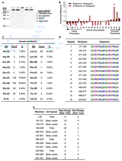 - Yaffe, M.B.; Beegen, H.; Eckert, R.L. Biophysical characterization of involucrin reveals a molecule ideally suited to function as an intermolecular cross-bridge of the keratinocyte cornified envelope. J. Biol. Chem. 1992, 267, 12233–12238. [Google Scholar] [CrossRef]