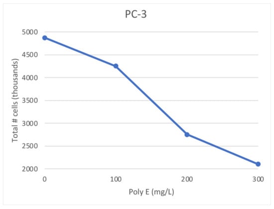 PC-3 prostate cancer cells were cultured in complete growth media supplemented with Poly E at varied concentrations for 24 h. Cultured cells were then collected and washed with 1× PBS, and cell concentrations were determined. There was a consistent pattern of decreasing cell growth with increasing Poly E concentrations (Figure 1). The 200 mg/L Poly E concentration treatment corresponded, approximately, to a 50% reduction in cell populations compared to untreated (0 mg/L Poly E) for the PC-3 (Figure 1; 0 mg/L vs. 200 mg/L Poly E) cell line.
