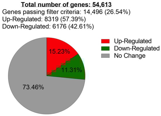 The Medium-level Poly E (200 mg/L) concentration tested had total cell numbers that corresponded to ~50% of the number of cells in the Poly E-untreated (0 mg/L) samples (Figure 1); therefore, these two samples were used for comparative DNA microarray analysis. RNA samples isolated from Poly E-untreated (0 mg/L) PC-3 cells, as well as from the Medium-Poly E- (200 mg/L) treated PC-3 cell samples, were delivered to the Moffitt Cancer Center Genomic Core Facility (Tampa, FL, USA) for microarray analysis. The resulting .CEL data files were analyzed using Applied Biosystems’s Transcriptome Analysis Console 4.0, using a >2-fold gene expression change filter to generate Figure 2. Of the 54,613 genes in PC-3 cells analyzed by DNA microarray, we found 8319 genes with increased expression levels >2-fold and 6176 genes with decreased expression >2-fold (Figure 2).