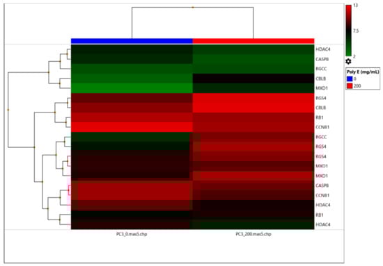 Poly E-treated PC-3 cell line microarray gene expression hierarchical clustering. Reporter probe signal intensities of the eight genes selected for qRT-PCR analysis are labeled with red representing upregulation and green representing downregulation in gene expression, relative to the middle-adjusted intensity depicted in black. A scale of signal intensity values ranging from 2 (lowest) to 13 (highest) is depicted at the top right of the heat map. Columns represent either untreated (left; 0 mg/L) or Poly E-treated (right; Mid 200 mg/L). Rows represent individual Affymetrix probes with gene symbols displayed to the right of each row. Hierarchical clustering of the genes analyzed is indicated by the nodal connections (left side of figure). Gene symbols (right side of figure) with their corresponding Affymetrix probe set IDs (from top to bottom of list): HDAC4 (1554322_a_at), CASP8 (1553306_at), RGCC (239827_at), CBLB (208348_s_at), MXD1 (206877_at), RGS4 (204337_at), CBLB (209682_at), RB1 (203132_at), CCNB1 (214710_s_at), RGCC (218723_s_at), RGS4 (204338_s_at), RGS4 (204339_s_at), MXD1 (226275_at), MXD1 (228846_at), CASP8 (213373_s_at), CCNB1 (228729_at), HDAC4 (204225_at), RB1 (211540_s_at), and HDAC4 (228813_at).