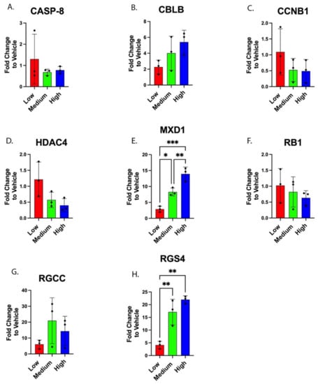Eight genes (CASP8, CBLB, CCNB1, HDAC4, MXD1, RB1, RGCC, and RGS4) were selected from DNA microarray data for more comprehensive qRT-PCR gene expression analyses of PC-3 cells treated with varied Poly E-treated concentrations (Figure 4). Cellular RNA samples were converted into cDNAs for templates in qRT-PCR analyses using the ΔΔCt method, with ACTB as the endogenous control. The qRT-PCR results for six of the eight genes analyzed did not discern significant differences (p-values > 0.05) in gene expression changes between the Poly E treatment groups (low, medium, high), including CASP8 (Figure 4A), CBLB (Figure 4B), CCNB1 (Figure 4C), HDAC4 (Figure 4D), RB1 (Figure 4F), and RGCC (Figure 4G). However, the observed decrease in HDAC4 gene expression between low- to high-Poly E concentrations (Figure 4D) was a 0.33-fold change, which approached significance (p-value = 0.076). The mean value decrease in HDAC4 gene expression at the High-Poly E concentration, compared to untreated (vehicle only), was 0.40-fold (Figure 4D, High Poly E). The two Poly E dose-dependent increases observed in CBLB gene expression (Figure 4B, low vs. medium and medium vs. high) were not significant (p-values = 0.158 and 0.838, respectively), even though the increase in the mean values of gene expression fold-change between the low- and high-Poly E concentrations (Figure 4B, Low vs. High) was 2.38-fold (p-value = 0.113). At the highest Poly E concentration tested, the CBLB mean value for gene expression change was 5.41-fold compared to Poly E untreated PC-3 cells (Figure 4B, High). The fold changes in RGCC gene expression (Figure 4G, low vs. medium and medium vs. high) were not significant (p-values = 0.244 & 0.715, respectively) between Poly E treatment groups; however, the highest mean value increase in RGCC gene expression was 20.91-fold at the medium Poly E concentration. Three genes (CASP8, CCNB1, and RB1) lacked significance in the changes in gene expression levels between Poly E treatment groups, and had mean values of gene expression fold-changes of <2-fold.