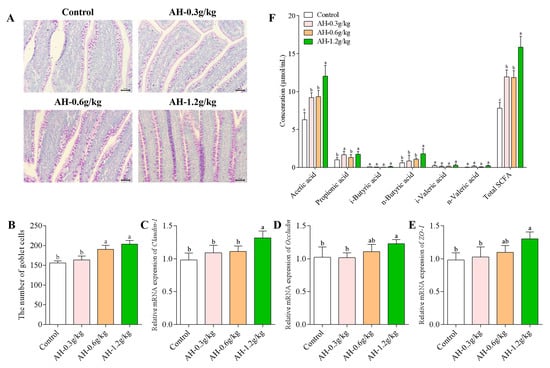 2.5. Influence of Alhagi Honey Polysaccharides on the Number of Goblet Cells, the mRNA Expression of Claudin-1, Occludin, and ZO-1 proteins in Ileum, and the SCFAs Production in Cecum