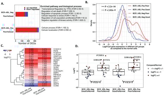 To further focus on studying gene alterations in the cells from distinct TKI responders, we conducted differential gene expression analysis between the stem cells from the patients with good and poor responses in the BCR-ABL+ and BCR-ABL− clusters, respectively. A total of 10411 and 9639 genes that were expressed in at least 10% of BCR-ABL+ and BCR-ABL− from both good and poor responders were used in the differential expression analysis. As a result, 362 and 192 differentially expressed genes (abs(logFC) ≥ 1 and padj ≤ 0.05) were identified in the BCR-ABL+ and BCR-ABL− cell groups. Among these genes, 93.6% (339/362) and 76% (146/192) were upregulated in the cells of poor responders compared to the cells of good responders in the BCR-ABL+ group and BCR-ABL− group, respectively (Figure 2A). When compared to normal HSCs, the expression change distributions of these genes were significantly different between the patients with good and poor responses for BCR-ABL+ (Kolmogorov–Smirnov test, p < 2.2 × Figure 2B, solid red vs. blue curves) and BCR-ABL− stem cells (Kolmogorov–Smirnov test, p < 2.82 × , Figure 2B, dashed red vs. blue curves). The majority of these genes had elevated expression levels in the cells of poor responders than their expression in the normal HSCs in both BCR-ABL+ and BCR-ABL− cells (Figure 2B, red curves).